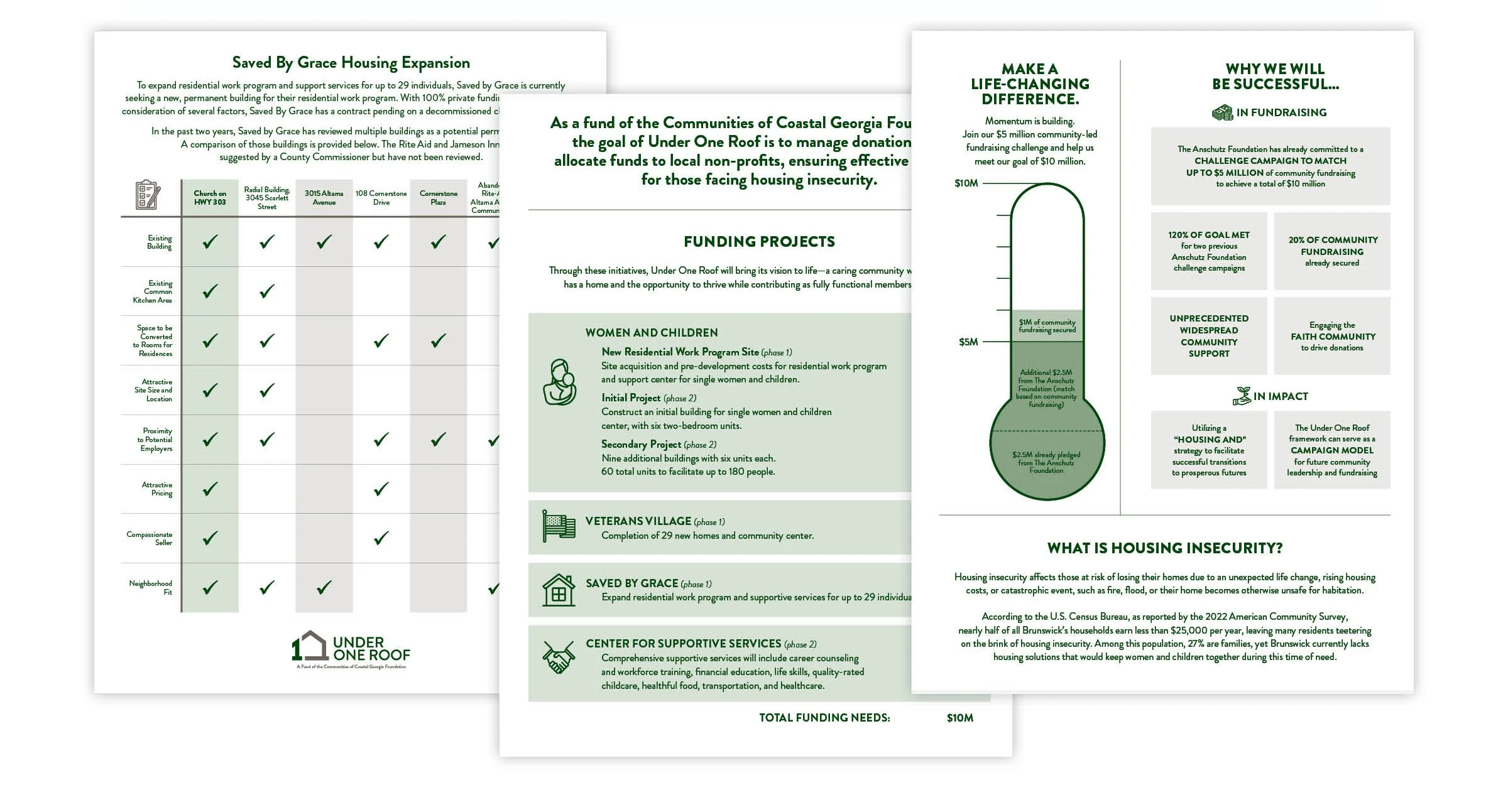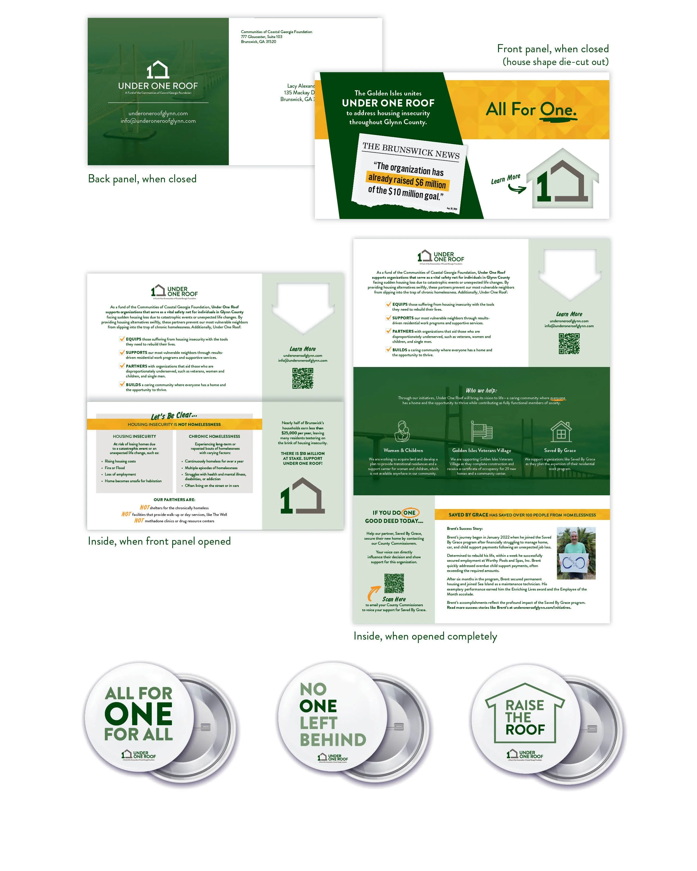 Under One Roof, a fund of the Communities of Coastal Georgia Foundation, provides crucial support to Glynn County residents facing homelessness due to unforeseen hardships. The branding and collateral were designed to reflect the initiative’s purpose: a rallying cry for the community to unite in support of neighbors struggling with housing insecurity. The visual identity features calming green hues, inspired by the region’s marshlands, symbolizing renewal, stability, and hope.